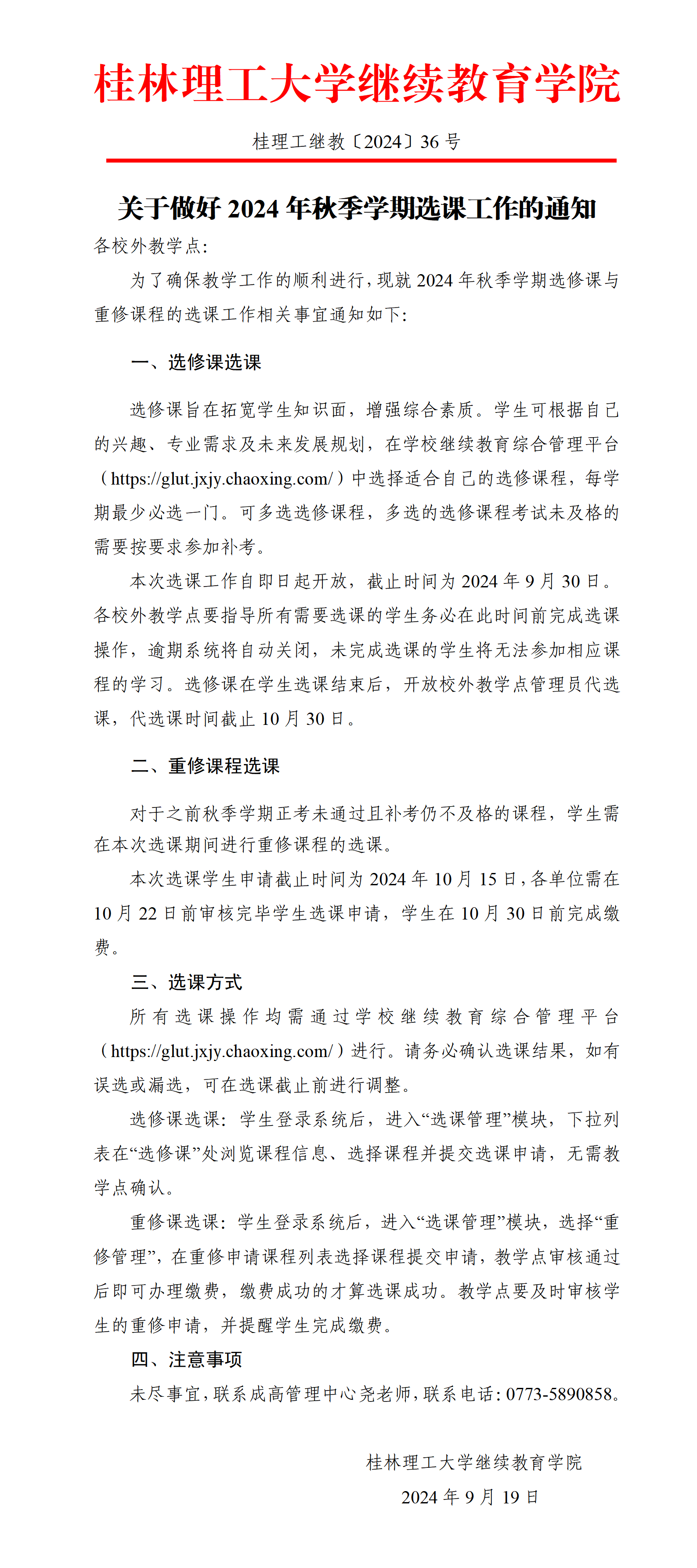 关于做好2024年秋季学期选课工作的通知 发布者:成高管理中心 2024-09-19 已阅人次 (一审:尧田坤 二审:林文钊 三审:李衡) 上一条:关于做好2024年秋季学期bv伟德源自英国始于1946高等教育自学考试有关工作的通知 下一条:关于做好 2024年秋季学期成人高等教育有关工作的通知 关注我们