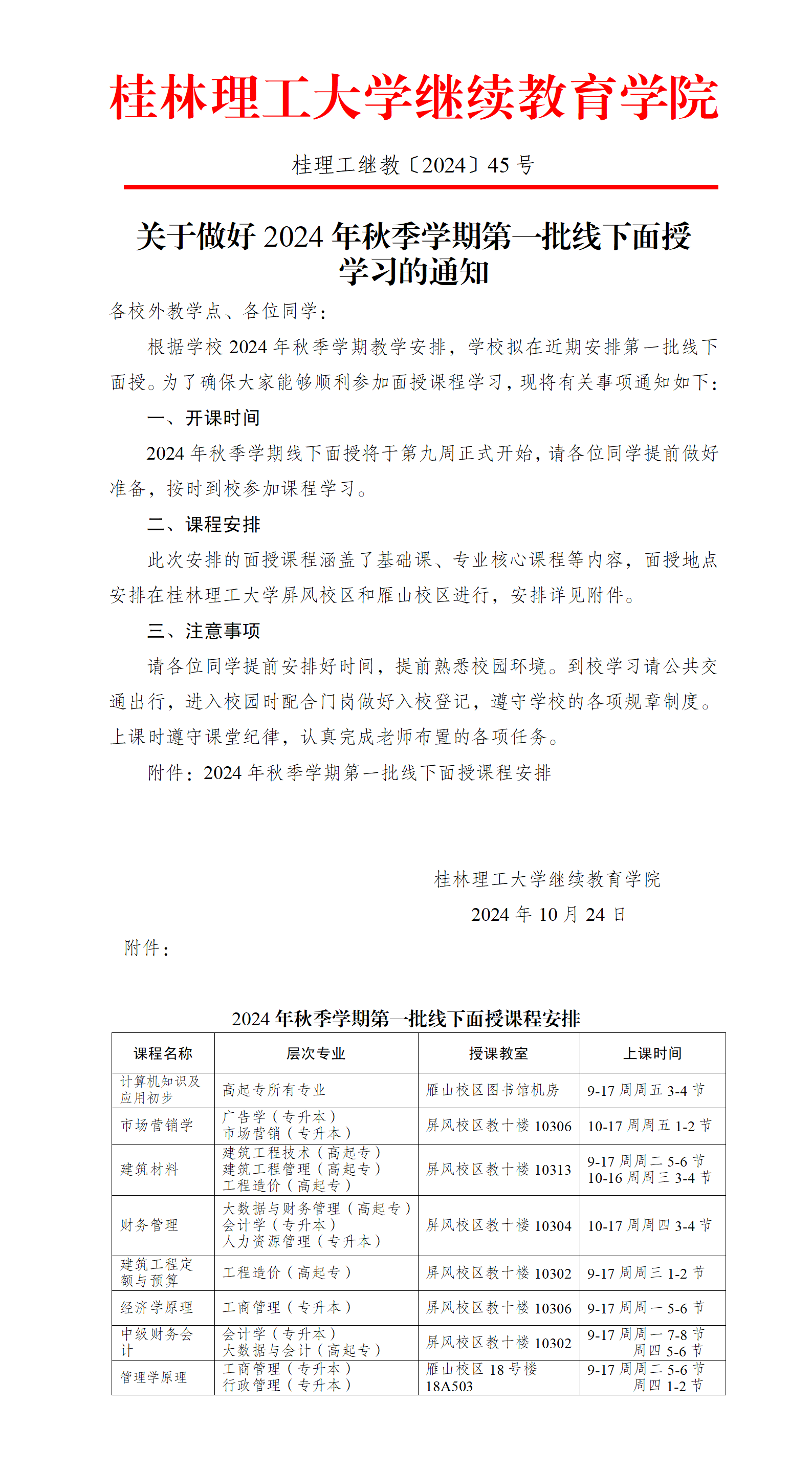 关于做好2024年秋季学期第一批线下面授学习的通知 发布者:成高管理中心 2024-10-24 已阅人次 (一审:尧田坤 二审:林文钊 三审:李衡) 上一条:关于做好2024年秋季学期成人高等教育毕业资格审核及毕业证办理工作的通知 下一条:关于做好2024年秋季学期成人高等教育学位外语免考申请工作的通知 关注我们