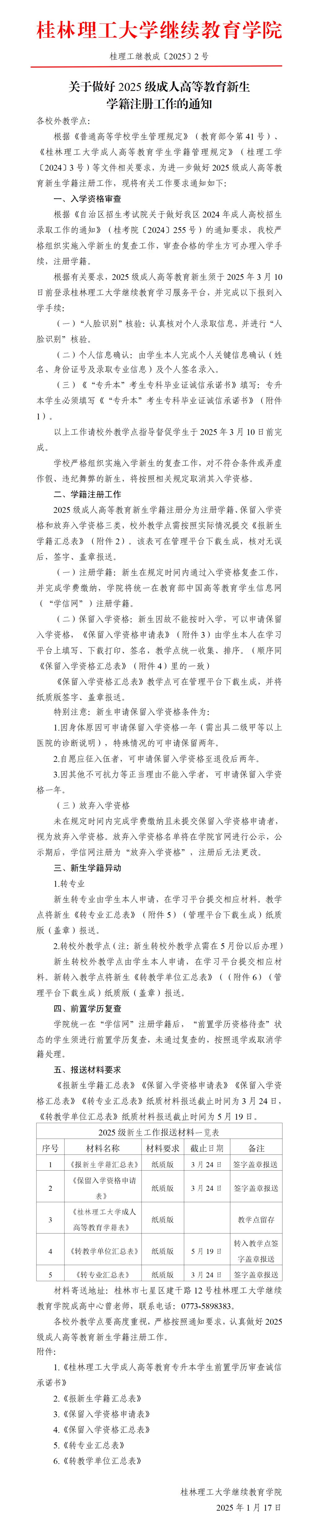 关于做好2025级成人高等教育新生学籍注册工作的通知 发布者:成高管理中心 2025-01-17 已阅人次 (一审:曾婕 二审:林文钊 三审:李衡) 上一条:关于做好2025年春季学期成人高等教育学生学籍异动工作的通知 下一条:关于公布修订后的《bv伟德源自英国始于1946高等学历继续教育本科毕业设计(论文)撰写规范》的通知 关注我们