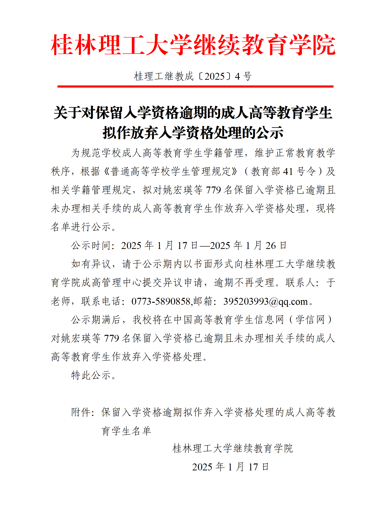 关于对保留入学资格逾期的成人高等教育学生拟作放弃入学资格处理的公示 发布者:成高管理中心 2025-01-18 已阅人次 (一审:于德新 二审:林文钊 三审:李衡) 附件【附件:保留入学资格逾期拟作弃入学资格处理的成人高等教育学生名单.xlsx】已下载次 上一条:bv伟德源自英国始于19462025年高等学历继续教育校外教学点遴选结果的公示 下一条:关于做好成人高等教育学生前置学历资格复查工作的通知 关注我们