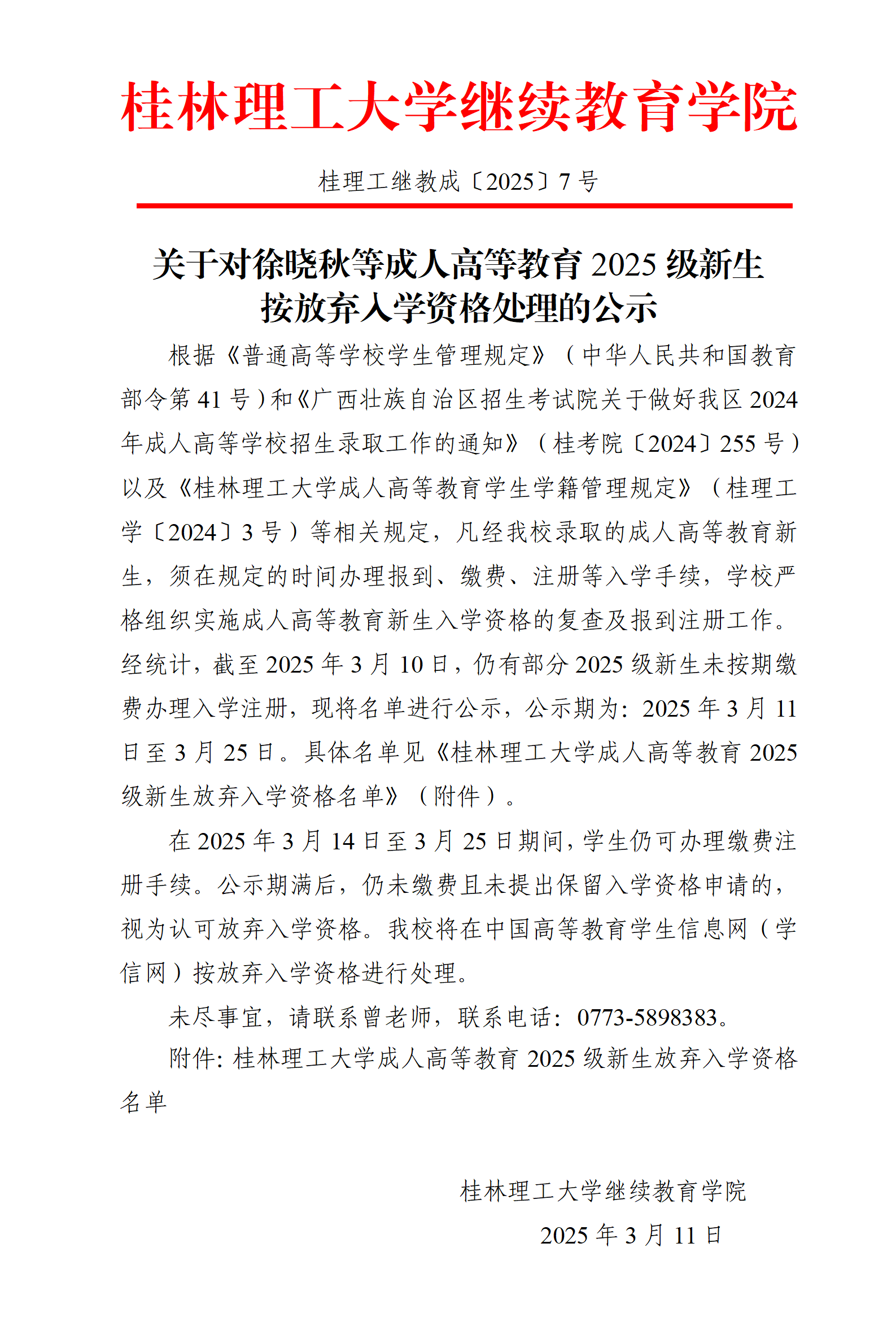 关于对徐晓秋等成人高等教育2025级新生按放弃入学资格处理的公示 发布者:成高管理中心 2025-03-11 已阅人次 (一审:曾婕 二审:林文钊 三审:李衡) 附件【bv伟德源自英国始于1946成人高等教育2025级新生放弃入学资格名单.xlsx】已下载次 上一条:bv伟德源自英国始于1946关于成人高等教育学生申请更改个人信息的管理规定 下一条:关于做好2025年春季学期成人高等教育课程重修工作的通知 关注我们